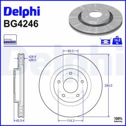Manufacturer: DELPHI Brake Disc Type : Vented Number of Holes : 5 Test Mark : E1 90R-02C0958/2527 Surface : Oiled Outer diameter [mm] : 294 Brake Disc Thickness [mm] : 26 Minimum thickness [mm] : 24,4 Centering Diameter [mm] : 69 Height [mm] : 45,5
