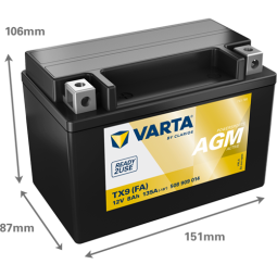 Voltage [V] : 12 Battery Capacity [Ah] : 8 Cold-test Current, EN [A] : 135 Post Positions : 1 Terminal Type : Y4 Hold-down Type : B00 Length [mm] : 151 Width [mm] : 87 Height [mm] : 106Suitable vehicles